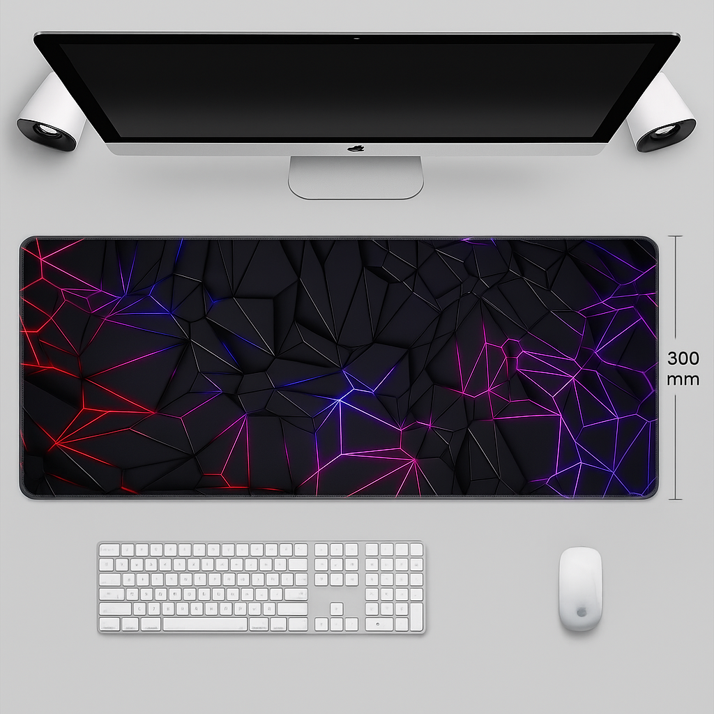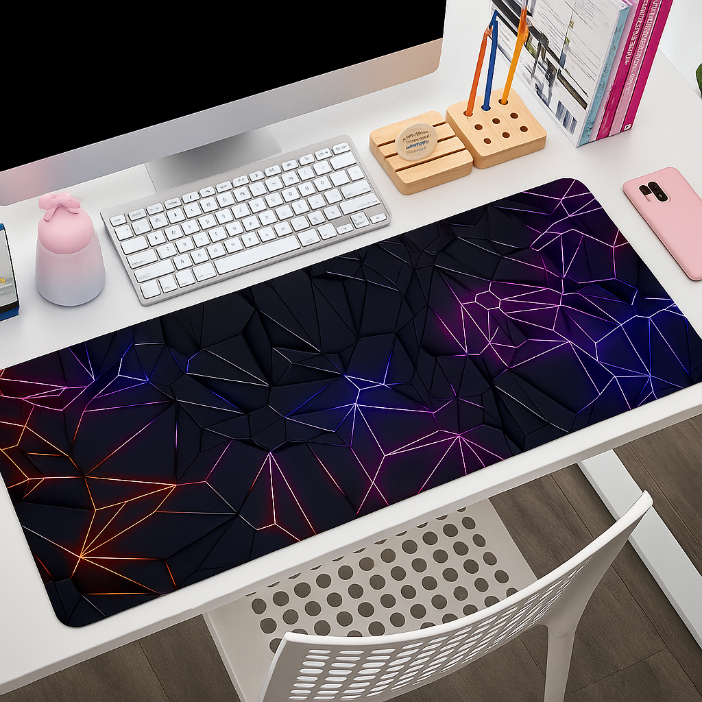 Geometric RGB Glow Desk Mat – Extended Anti-Slip Gaming & Office Desk Pad (UHD Print)