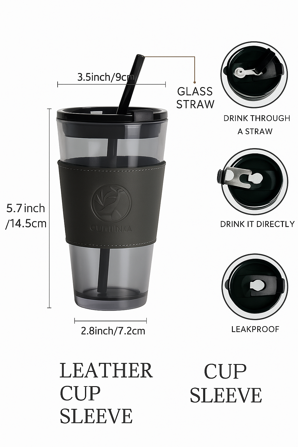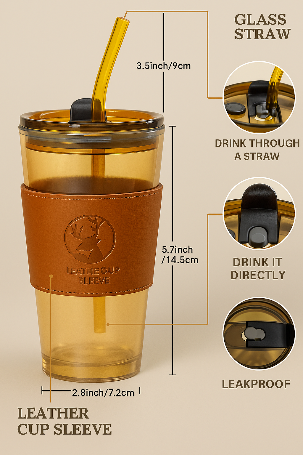 Name : Glass Coffee Tumbler With Leather Grip Straw Sipper Juices Cocktail Smoothies Glass Coffee Mug (450 ml)