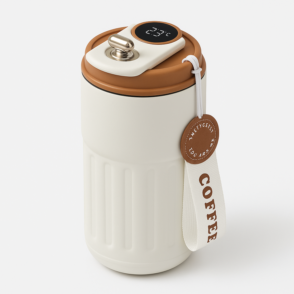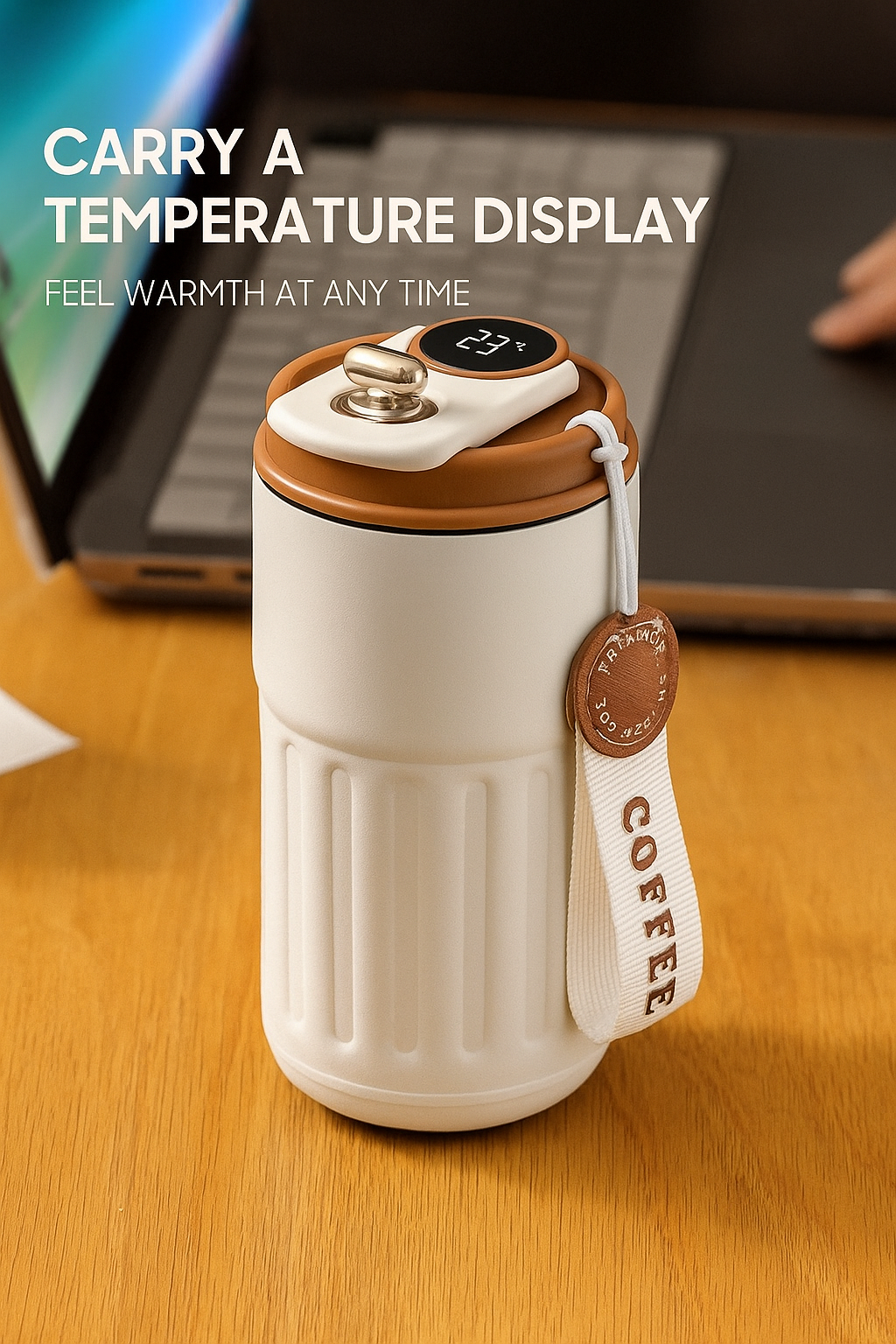 Coffee Mug Cup Digital Display, Thermos Flasks, 460 ml, 316 Stainless Steel Travel Mug, Insulated Vacuum Thermal Mug, Leak-Proof Travel Mug with Lid for Coffee (White Brown)