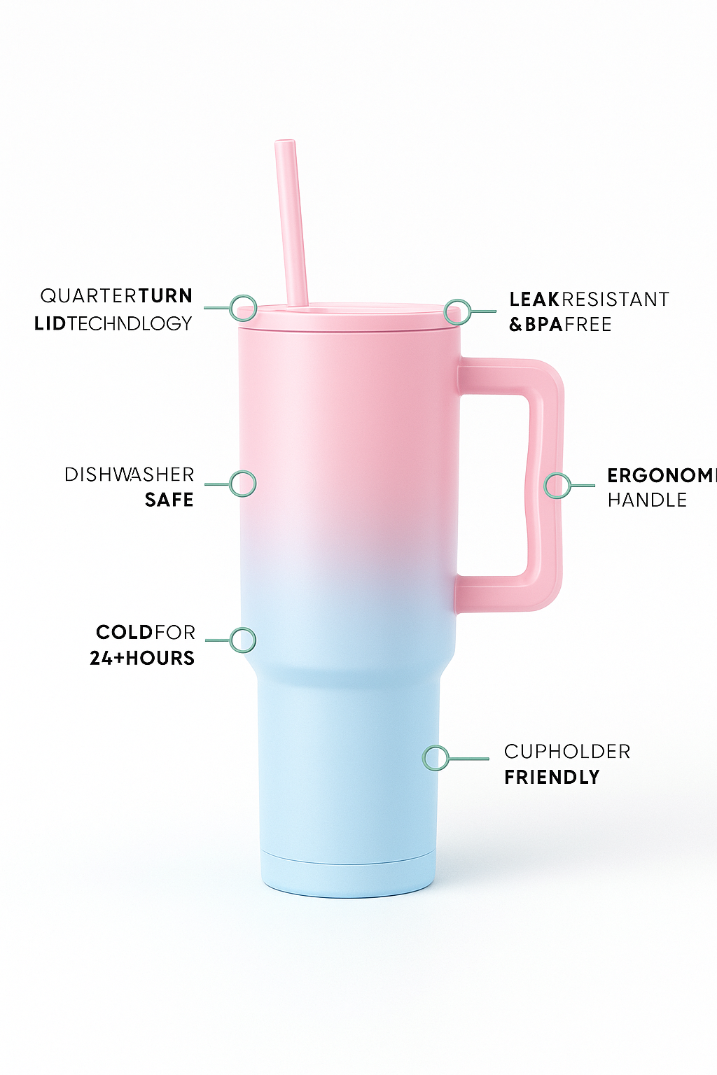 1200ML Stainless Steel Tumbler Hot and Cold with Handle and Lid 2 Straw, Double Insulated Cup 100% Leak Proof Mug Cupholder for Gym, Travelling (Cotton Candy Haze)